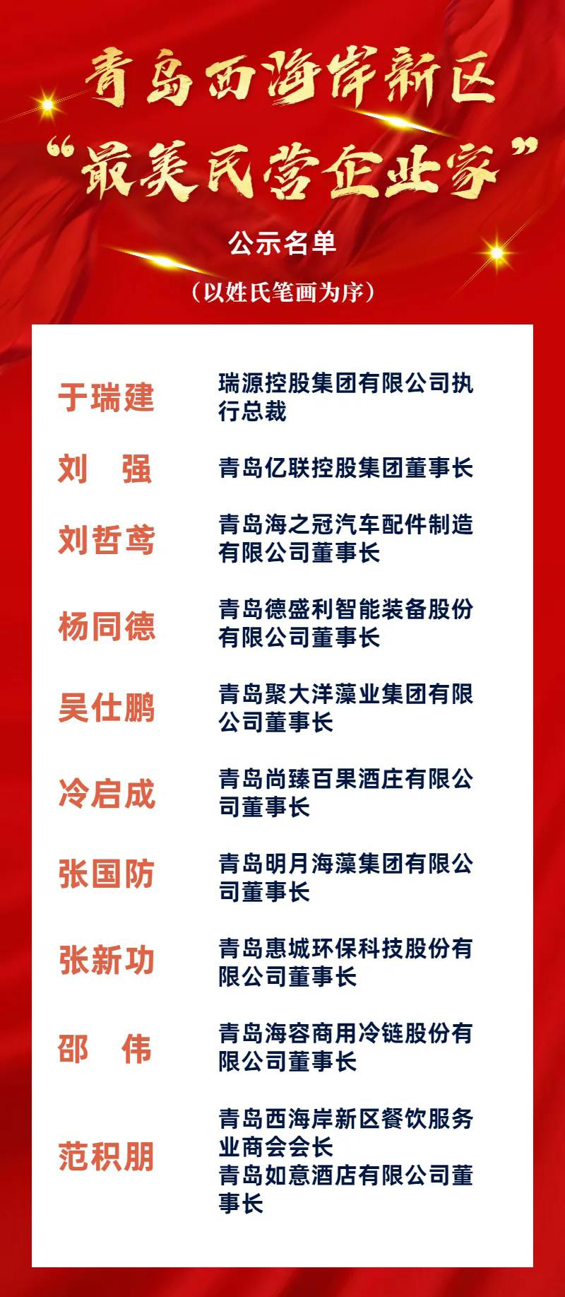 日,工委區委統戰部、工委區委宣傳部、區工商業聯合會(區民營經濟發展局)聯合開展青島西海岸新區“最美民營企業家”評選活動。經過廣泛宣傳發動、優秀典型推薦、綜合評價、聯合評分等程序,評選出10名青島西海岸新區“最美民營企業家”,青島惠城環保科技股份有限公司董事長、總經理張新功入選。