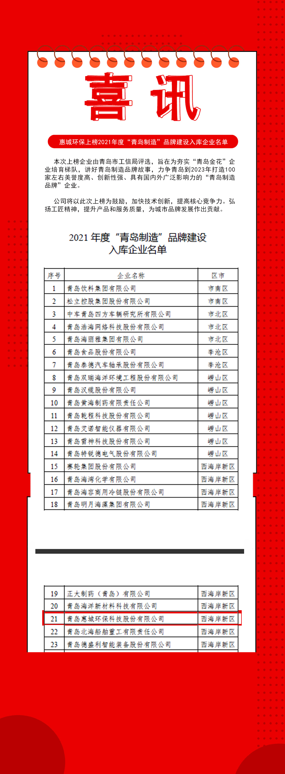 熱烈祝賀公司上榜2021年度“青島制造”品牌建設(shè)入庫(kù)企業(yè)名單